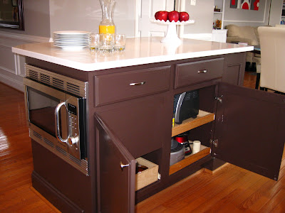 A shelf was created to back upwards the microwave. Also, a partitioning (1/4” plywood piece), was placed inwards the middle of the whole isle cabinet.