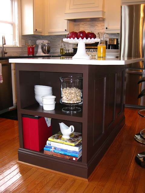 Next step, nosotros removed the electrical outlet keeping it inwards the within of the isle (for microwave use), as well as adding a novel i (well, my dearest married adult man worked on this), on the left side of the newly built bookcase for kitchen use. The corner pieces as well as shoe molding from the Island were also removed. Pieces of ¼” plywood were house all around except on the doors side. The bookshelf was attached to the isle making certain the openings for the electrical were already done.
